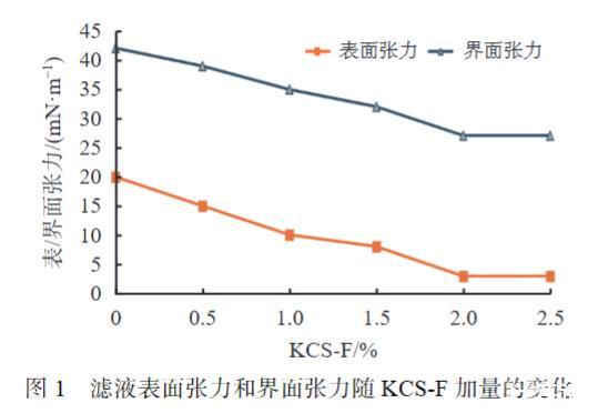 圖1濾液表面張力和界面張力隨KCS-F加量的變化
