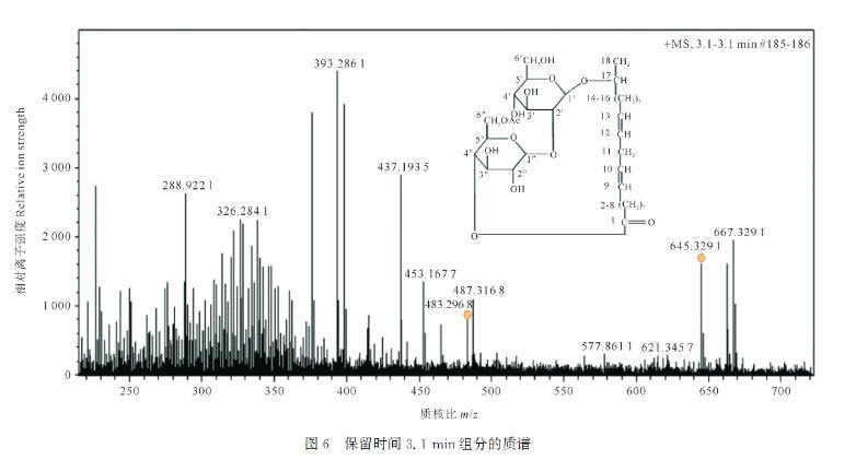 保留時間為3.1 min時色譜峰豐度最高。對該物質進行詳細分析,質荷比(m/z)645.32的碎片為單乙酰基取代的內酯型槐糖脂的分子離子峰,m/z 667.32為[M+Na]+峰,m/z 483.29為[M+H-C8H12O6]+峰,其中C8H12O6為乙酰基取代糖環。上述分析表明此物質為內酯型槐糖脂,具體名稱為:17-L-[(2'-O-β-D-吡喃葡萄糖基-β-D-吡喃葡萄糖基)-O-]十八二烯酸-1',4″-內酯-6″乙酸酯。