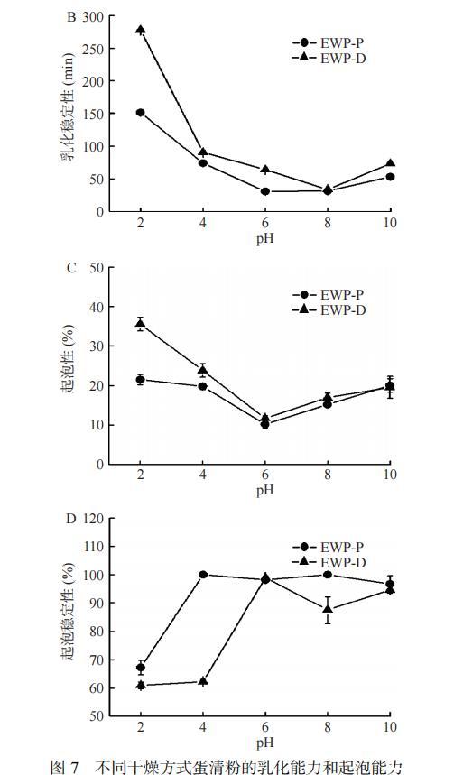 Dabbour等研究向日葵蛋白時也發(fā)現(xiàn)所有的蛋白樣品在pH6.0時的起泡性最低,且冷凍干燥樣品的起泡性優(yōu)于對流烘箱干燥樣品。另一方面,泡沫穩(wěn)定性與蛋白膜的強度有關,蛋白質(zhì)在攪打時,蛋白質(zhì)分子被吸附在空氣-水界面,蛋白質(zhì)分子重新排列,使其疏水部分朝向氣相方向,這種變化容易引起巰基的氧化,在空氣-水界面與相鄰的蛋白質(zhì)分子中的巰基形成二硫鍵,從而增強界面膜的強度,有利于泡沫穩(wěn)定性。EWP-P的泡沫穩(wěn)定性大于EWP-D,可能是因為噴霧干燥可能導致更多的蛋白質(zhì)展開,表面游離巰基含量較多。另一方面可能是因為EWP-P發(fā)生了美拉德反應,在空氣-水界面上可以形成的厚的粘彈性美拉德產(chǎn)物層,有利于泡沫穩(wěn)定性的增加。Zeng等研究不同干燥方式對雞皮膠原蛋白多肽時也發(fā)現(xiàn)噴霧干燥使其蛋白樣品的泡沫穩(wěn)定性優(yōu)于冷凍干燥樣品。