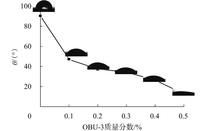 圖5 OBU-3質(zhì)量分?jǐn)?shù)對原油處理巖石薄片后接觸角的影響