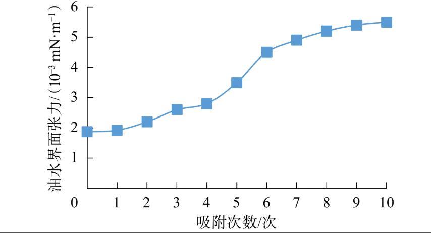 圖4為使用巖心粉對質(zhì)量分?jǐn)?shù)為0.5%的OBU-3溶液重復(fù)進(jìn)行10次吸附實(shí)驗(yàn)后的油水界面張力情況。從圖4可看出:隨著吸附次數(shù)的增加,油水界面張力增加;經(jīng)過10次吸附后,油水界面張力仍在超低界面張力范圍內(nèi)。這說明OBU-3低黏表面活性劑體系在巖心上吸附較少,吸附多次后,在油水界面上仍足以使界面張力處于超低值,滿足驅(qū)油對表面活性劑的要求。