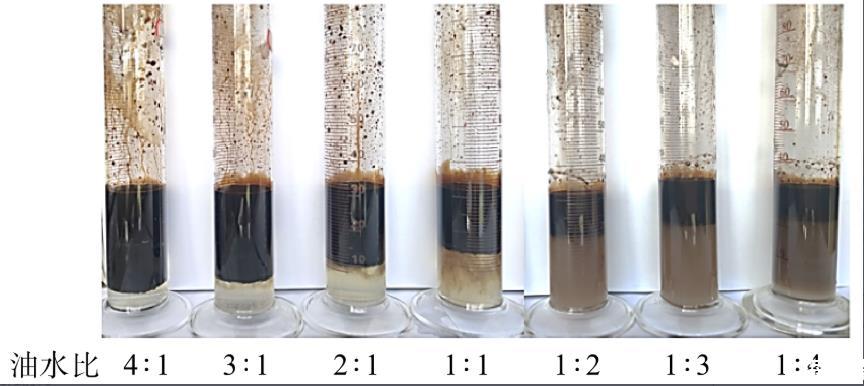 圖3為在45℃放置24 h后不同油水體積比條件下OBU-3低黏表面活性劑體系對油水的乳化情況。從圖3可看出,部分乳液分層嚴(yán)重,破乳效果較好。OBU-3對油水的乳化程度隨著油水體積比的增加而減小,油水體積比為4∶1、3∶1、2∶1、1∶1時(shí)分離出的水顏色較淺,油水分離效果較好。