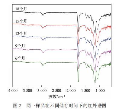 為了探究表面轉移涂層是否發生了結構變化,對不同儲存時間下的樣品進行紅外光譜測試分析,見圖2。可以看出,儲存時間為6—18個月的樣品的紅外譜圖并未發生明顯變化。譜圖的一致性證明了噴鋁紙表面轉移涂層的基本結構并未隨著時間發生明顯變化,即掉墨現象的出現并非由于轉移涂層出現結構變化導致。根據相關研究,噴鋁紙在儲存的時候,紙張及涂層中添加的助劑,環境介質中的水分子、油污和空氣等小分子物質會通過吸附、擴散、遷移和凝集等作用,甚至鍵合等途徑,在轉移涂層表面形成低分子物質的富集區,即弱界面層,降低了轉移涂層的表面張力,并使其印刷適性變差。