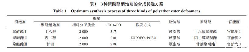 使用硬脂酸和不同聚醚進行酯化反應,獲得的聚醚酯消泡劑分別為官能度1、2、3的聚醚酯消泡劑,詳情見表1。以聚醚官能度為變量,分析官能度對聚醚酯消泡劑在不同白水中的消泡性能。