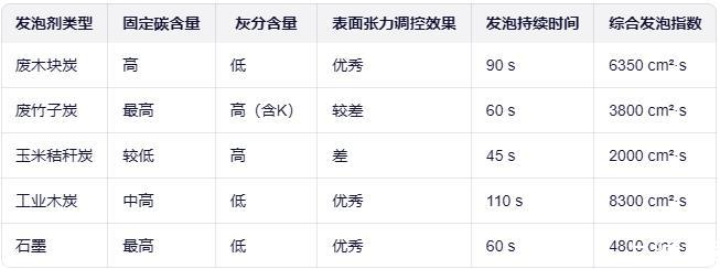 從數(shù)據(jù)可見,廢木塊炭和工業(yè)木炭因固定碳高、灰分低,表面張力調(diào)控能力優(yōu)秀,發(fā)泡持續(xù)時間長,綜合性能突出。廢竹子炭雖固定碳最高,但灰分中高鉀元素導致表面張力變化過快,泡沫穩(wěn)定性下降。