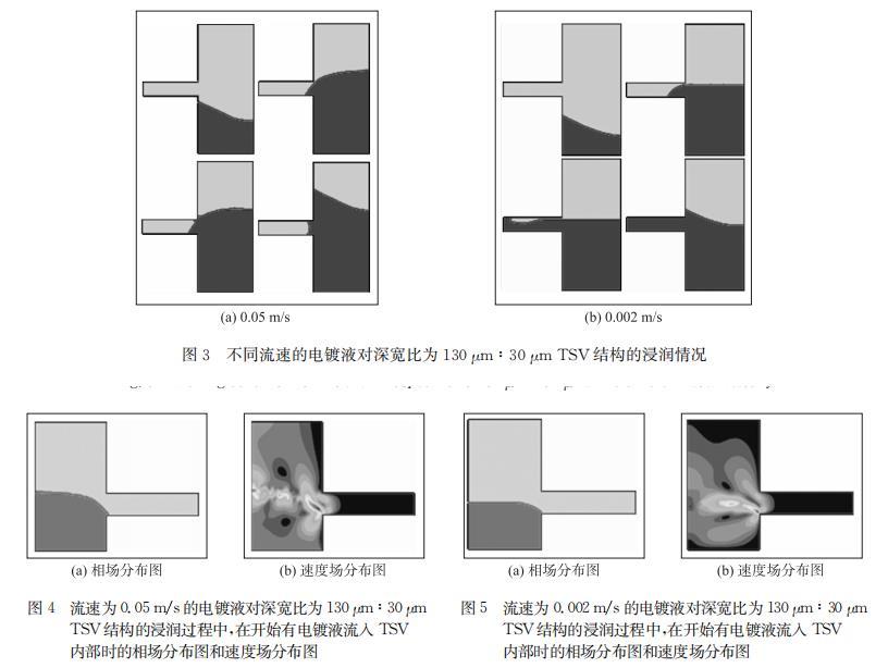 TSV深寬比設(shè)置為130μm:30μm,電鍍液流人速度為0.05 m/s和0.002 m/s的浸潤(rùn)仿真結(jié)果分別如圖3所示,前者在TSV底部形成氣泡,后者可以完全浸潤(rùn)。模擬結(jié)果表明降低電鍍液流入速度有利于浸潤(rùn)。通過仿真中兩種情況下浸潤(rùn)過程中的流速場(chǎng)對(duì)比,可以看出在電鍍液流入的過程中,電鍍液流人速度較大時(shí),如圖4(b)所示,電鍍液表面距離TSV較遠(yuǎn)的部分有著相對(duì)更大的流速,即電鍍液流過TSV上方的速度大于電鍍液向TSV內(nèi)部流入的速度,導(dǎo)致在電鍍液流過TSV上方時(shí),其流入TSV內(nèi)部的分流量還沒有充滿TSV內(nèi)部排出其中氣體之前,電鍍液就已經(jīng)流過了TSV上方,并將TSV口部封死,導(dǎo)致內(nèi)部殘留氣體無法排出,形成不完全浸潤(rùn);而當(dāng)電鍍液流入速度較小時(shí),如圖5(b)所示,電鍍液表面在TSV口部附近具有相對(duì)更大的流速,即電鍍液向TSV內(nèi)部流入的速度大于其流過TSV上方的速度,使得電鍍液流過TSV上方時(shí),有足夠的分流量流入TSV內(nèi)部,將其中氣體排出并將TSV填滿,實(shí)現(xiàn)完全的浸潤(rùn)。