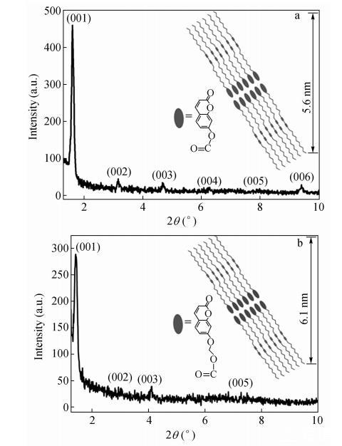 在2θ=2°~10°范圍內(nèi)出現(xiàn)的多個等距離Bragg衍射峰表明得到的CODA和CO2DA LB膜具有很好的周期性結(jié)構(gòu)。假定從左至右Bragg衍射峰依次為(001),(002),...,(006),用Bragg方程對各級衍射峰進行計算可得CODA和CO2DA LB膜層狀結(jié)構(gòu)間距為5.6nm和6.1nm。CO2DA LB膜的Bragg衍射峰較寬,強度較弱,Bragg衍射峰隨角度的增大衰減很快,說明CO2DA LB膜中分子排列較CODA LB膜中松散,存在局部的缺陷。理論計算充分展開的CODA和CO2DA分子鏈長約為3.5nm和3.6nm,所以觀察到的周期結(jié)構(gòu)包含雙層的CODA和CO2DA分子。我們可以預(yù)想雙層結(jié)構(gòu)的中間區(qū)域是香豆素基團經(jīng)過強烈的π-π堆積作用形成的,而雙層結(jié)構(gòu)單元的外部為烷基側(cè)鏈。香豆素取代二乙炔單體的規(guī)則排列是二乙炔單元進行拓撲聚合的先決條件。