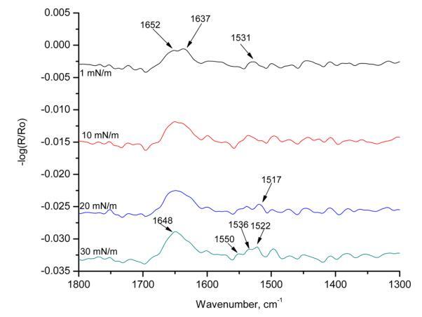 圖7顯示了HI-Langmuir單層在不同表面壓力下60°時(shí)的p極化。 這條帶子在1517厘米處 ? 1對應(yīng)于α-螺旋。 在1 mN/m的表面壓力下,有兩個(gè)可見帶:1652和1637 cm ? 1. 隨著表面壓力的增加,這兩個(gè)譜帶重疊并成為一個(gè)寬帶。 在30百萬米 ? 1,波段可視為單個(gè)波段,頻率為1648厘米 ? 1. 這是對應(yīng)于α-螺旋的酰胺II區(qū)域的條帶。 下一個(gè)波段在1531厘米處以1 mN/m的寬帶出現(xiàn) ? 1. 隨著表面壓力的增加,它分成三個(gè)帶:1550、1536和1522厘米 ? 1. 在1550和1522厘米處的頻帶 ? 1分別對應(yīng)于α-螺旋和β-折疊中的酰胺II區(qū)域。 這種譜帶分裂表明,譜帶位于1531厘米處 ? 在較低的表面壓力下,1由α-螺旋和β-片組成。 在較高的表面壓力下,譜帶分離為離散的單個(gè)峰。 光譜中出現(xiàn)的其他峰是由于氨基酸和烷烴鏈的存在。 這條帶子長1448厘米 ? 1對應(yīng)于C ? H CH2和CH3的剪切。 HI-Langmuir單分子膜的p-極化輻照度中存在所有三個(gè)表明α-螺旋的主譜帶。