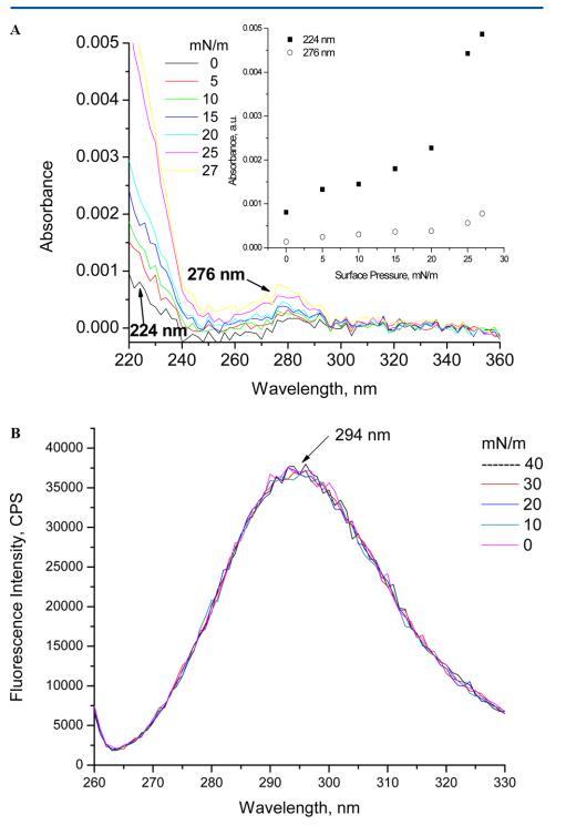 圖5.(A) 紫外線 ? 亞相pH值為5.6時(shí)人胰島素Langmuir的可見光譜。 插圖顯示了224和276 nm處吸光度隨表面壓力的變化。 (B) 亞相pH 5.6下人胰島素朗繆爾的熒光光譜(λ激發(fā)=270 nm,激發(fā)和發(fā)射時(shí)的狹縫寬度分別為5和5 nm)。