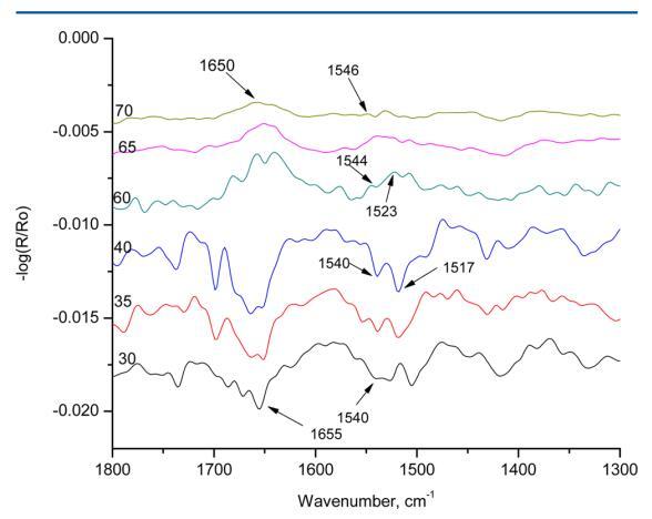 圖8顯示了HI-Langmuir單層在10 mN m處的p極化 ? 1在30、35、40、60、65和70°的六個(gè)不同角度。 在布儒斯特角之前,30、35和40 mN/m處的角未顯示出β片的特征帶。 所有三個(gè)角度顯示1655和1540厘米處的條紋 ? 1分別對應(yīng)于酰胺I和酰胺II吸收。 這條帶子在1517厘米處 ? 1,對應(yīng)于α-螺旋,在35°和40°中存在。 在布儒斯特角之后,所有60、65和70°的三個(gè)角都顯示出介于1650和1655之間的帶,這對應(yīng)于α-螺旋中的酰胺I吸收。 當(dāng)角度為60°時(shí),在1523 cm處可以看到峰值 ? 1,對應(yīng)于β片。 光譜中的其他譜帶都不是α-螺旋或β-片的特征。 光譜表明HI在空氣中以α-螺旋的形式存在 ? 水界面。 在10 mN m的恒定壓力下,隨著角度的增加 ? 1,發(fā)現(xiàn)光譜中的α-螺旋特征減少。