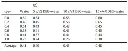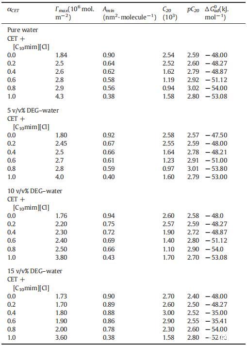 表4純CET、[C10min][Cl]和CET+[C10min][Cl]混合物的表面過剩(Γmax)、每分子最小面積(Amin)、吸附效率(pC20)和吸附自由能(ΔGad 0),作為純水中CET摩爾分數(shù)α的函數(shù),并且在T=298.15K時存在不同體積百分比的二元DEG-水混合物。