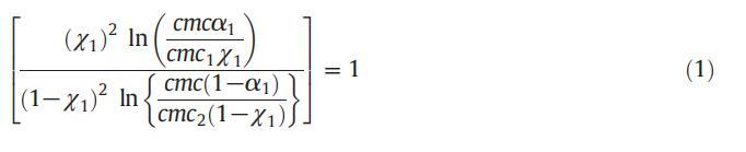 應用正規(guī)溶液理論,可以計算混合膠束中表面活性劑分子之間的相互作用參數(shù)(β)值,從而提供表面活性劑分子之間相互作用強度的信息。借助正規(guī)溶液理論(RST),膠束摩爾分數(shù)也可以使用魯賓方程計算: