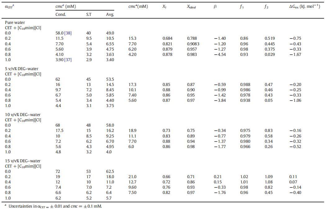 表1(cmc)、平均值(cmc)、理想值(cmc*)、膠束組成(X1,Xideal)、相互作用參數(shù)(β)的值,混合物CET+[C10min][Cl]的活度系數(shù)(?1,?2)和混合過量自由能(ΔGex),作為純水中CET摩爾分數(shù)(α)的函數(shù),以及在T=298.15 K時DEG-水二元混合物的不同體積百分比。