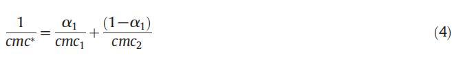 應用偽相模型,我們可以計算二元混合物的理想cmc,該模型基于這樣的假設,即膠束被視為宏觀相,與溶液中相應的單體處于平衡狀態(tài)。理想cmc值與單個cmc相關,可使用Clint公式(4)計算: