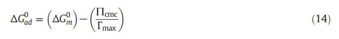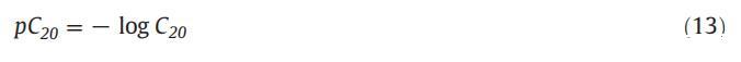 為了計算吸附效率,重要的是要知道產(chǎn)生最大吸附量的兩親分子的摩爾濃度。最大吸附量出現(xiàn)在表面張力降低到20mn·m時?1[64]和C20是該點的摩爾濃度。用pC20表示的兩親分子的吸附效率如下所示: