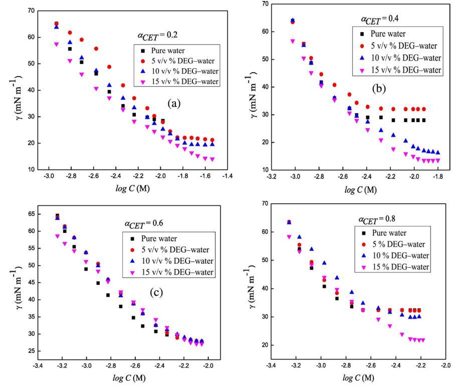 圖2.在T=298.15 K時,二甘醇-水二元混合物的不同體積百分比下,混合體系的表面張力,γ與對數(shù)[濃度]的關系曲線,CET+[C10min][Cl](a)αCET=0.2(b)αCET=0.4,(c)αCET=0.6和(d)αCET=0.8。