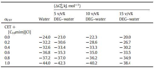 表3:在T=298.15 K時,CET+[C10min][Cl]混合物在純水以及不同體積百分比的二甘醇-水二元混合物中的膠束化標準吉布斯自由能(ΔGm0)值。
