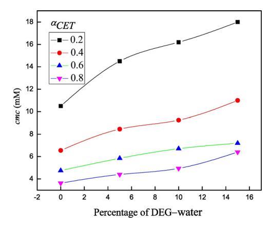 圖3。不同DEG-水混合物體積百分比下cmc的變化(a)αCET=0.2(■),(b)在298.15 K時,αCET=0.4(),(c)αCET=0.6()和(d)αCET=0.8()。
