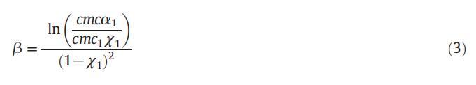 由β表示的相互作用參數(shù)給出了混合膠束中兩個單體之間的吸引相互作用的信息,可使用式(3)計算: