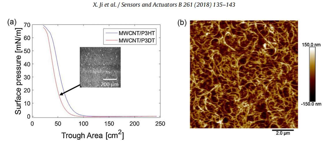 圖3。(a)MWCNT/P3HT和MWCNT/P3DT單分子膜的表面壓力與槽面積等溫線,以及15 mN/m下MWCNT/P3DT單分子膜的BAM圖像。(b)15 mN/m下轉移到PDMS基底上的MWCNT/P3DT單分子膜的AFM圖像。