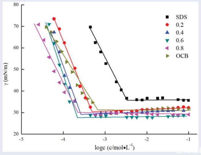 用表面張力法研究了橄欖油兩性表面活性劑(羧基甜菜堿OCB和磺基甜菜堿OSB)與陰離子表面活性劑十二烷基苯磺酸鈉(SDBS)在不同摩爾分數(shù)下的表面性質。研究了無機鹽(NaCl、MgCl2)的加入對OCB/SDBS和OSB/SDBS體系表面活性的影響。結果表明,這兩種混合體系在所研究的所有摩爾分數(shù)上都比它們各自的組分具有更低的CMC值和更高的表面活性。同時,根據(jù)正規(guī)溶液理論,通過膠束相互作用參數(shù)(βm)確定了OCB/SDBS和OSB/SDBS之間明顯的協(xié)同作用。觀察到,αOCB=0.6時的OCB/SDBS混合體系和αOSB=0.6時的OSB/SDBS混合體系表現(xiàn)出最強的協(xié)同作用。此外,添加無機鹽后,二元表面活性劑混合物表現(xiàn)出更好的表面活性,并且無機鹽金屬離子的不同價態(tài)對混合體系的表面能力影響不同:Mg2+>Na+。