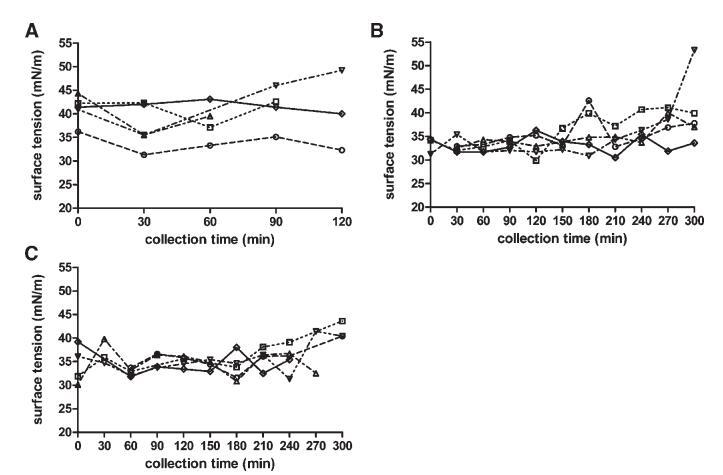 圖6。在禁食(A)、喂食(B)和高脂喂食(C)狀態下,表面張力(mN/m)隨餐后時間的變化。(--?--)主題1(··?··)主題2,(·–·)△·–·)主題3,(·-·▽·–·)主題4,(-◇–)科目5。