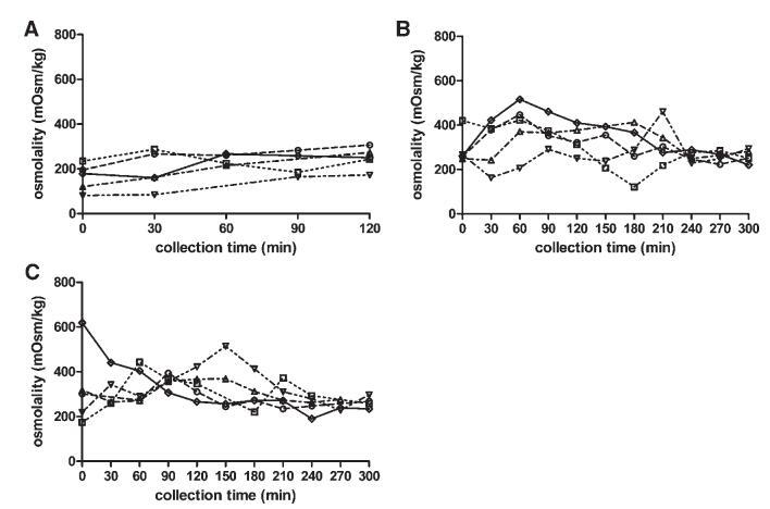 圖5。在禁食(A)、喂食(B)和富含脂肪的喂食(C)狀態HIF中,滲透壓(mOsm/kg)隨餐后給藥時間的變化。(--?--)主題1(··?··)主題2,(·–·)△·–·)主題3,(·-·▽·–·)主題4,(-◇–)科目5。