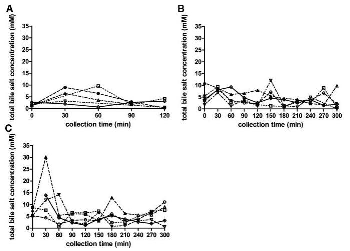 圖3。在禁食(A)、喂食(B)和高脂喂食(C)狀態HIF中,總膽汁鹽濃度(mM)隨餐后給藥時間的變化。(--?--)主題1(··?··)主題2,(·–·)△·–·)主題3,(·-·▽·–·)主題4,(-◇–)科目5。