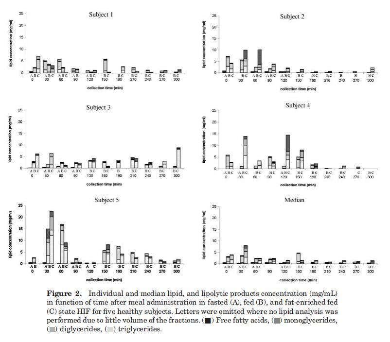 對于四名受試者(S2、S3、S4、S5),在禁食狀態HIF中發現微量脂質(平均0.4?0.3 mg/mL),這與Armand等人12報告的受試者1十二指腸吸出物中的禁食水平0.6 mg/mL相符,禁食狀態下的脂質濃度等于或高于30-120分鐘期間在喂食和富含脂肪的喂食狀態下測定的濃度(圖2)。這一觀察的可能原因可能與胃滯留時間和/或小腸上皮細胞的周轉率有關,從而釋放膜脂。在喂食和富含脂肪的喂食狀態之間,根據個體特征,沒有發現實質性差異。然而,中位數曲線顯示,進食30分鐘后,在高脂肪喂養狀態下,總脂質濃度顯著增加。由于沒有觀察到脂質產物在管腔內出現延遲,因此可以得出結論,服用液體膳食的脂肪含量的應用差異不會改變胃排空。先前已經證明,給予恒河猴的碳水化合物、蛋白質和脂肪等熱量負荷產生了相似的胃排空率,這表明胃排空是根據膳食的熱量密度進行調節的,而不管其營養成分如何。32