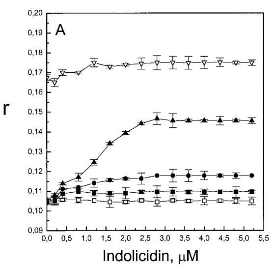 有趣的是,在存在酸性磷脂的情況下,肌動蛋白/脂質的摩爾比(在該摩爾比下,肌動蛋白的初始增量趨于穩定)分別為1:21、1:16和1:12.5,對應于XPG=0.1、0.2和0.4(圖2A),分別產生1:2、1:3和1:5的肌動蛋白/磷脂化學計量比。同時,DPH的初始r增量在magainin/脂質摩爾比為~1:30、1:12和1:5時趨于平穩(XPG分別為0.1、0.2和0.4),對應于大約1:3、1:2.5和1:2的magainin/PG化學計量比(圖3)。據報道,在這些肽/脂質摩爾比下,magainin可插入含酸性磷脂的膜中(Ludtke等人,1994年)。此外,已經證明,雙分子層中magainin的=-螺旋的方向取決于肽與脂質的摩爾比,在上述化學計量比下,螺旋應垂直于膜表面插入,在含PG的膜中形成孔(Ludtke等人,1996)。這些孔不僅由兩親螺旋的極性面組成,而且還由脂質的極性頭基組成,內外單層通過這些孔襯脂質是連續的。膜中的這種結構可能會降低探針芘部分微環境的極性,從而提高其量子產率。有趣的是,當XPG>0.1時,magainin 2逐漸降低Ie/Im值(圖3 A),這與增強的酰基鏈順序減少脂質側向擴散的速率一致。然而,由于magainin 2已經在XPG=0.1時增加了r,Ie/Im沒有變化,我們可以得出結論,PPDPG探針向微區富集以及其橫向擴散的減少正在發生。