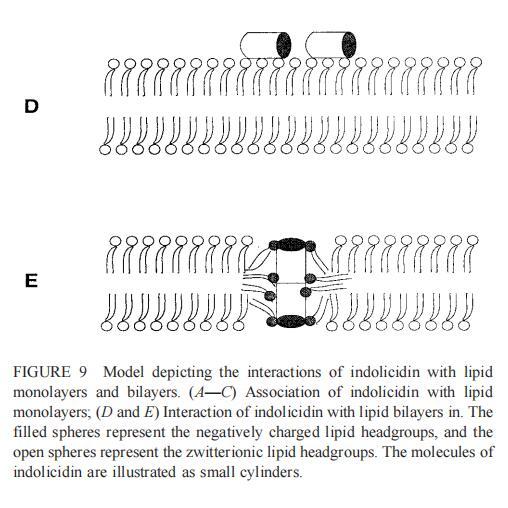 吲哚西丁只含有13個氨基酸,因此太短,無法跨越雙層。然而,該肽可以作為聚集物或帶有相關酸性磷脂的頭尾二聚體橫跨雙層(圖9 E),從而導致膜不穩定性。已經證明,吲哚西丁能夠通過穿過外膜殺死革蘭氏陰性細菌,并通過形成通道破壞細胞質膜(Falla et al.,1996)。與magainin 2的作用相比,吲哚青霉素誘導的內吞小泡較小(圖7)可能反映了這些肽與脂質相互作用的不同模式。一些吲哚肽分子可能會轉移到膜的內部小葉中。除了具有廣譜的抗真菌和抗菌活性外,吲哚西丁對哺乳動物細胞也有毒性(Schluesener等人,1993年;Ahmad等人,1995年)。有趣的是,吲哚西丁對SOPC和SOPC膽固醇巨型脂質體的作用不同。在這一階段,根本原因尚不確定,可能與膽固醇對雙層結構以及吲哚肽在膜中的取向的影響有關。因此,需要進一步的研究來闡明膽固醇對吲哚肽膜結合的影響。