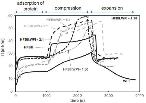 圖1。純蛋白質(zhì)系統(tǒng)WPI(右)和HFBII(左)以及口糧WPI:HFBII為10:1、3:1、1:1、1:3和1:10的混合系統(tǒng)的表面壓力等溫線。