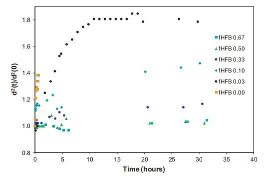 氣泡尺寸隨時(shí)間的相對(duì)增加如圖9所示,表示為d2(t)/d2(0)。考慮到環(huán)境充氣樣品的泡沫穩(wěn)定性,對(duì)于純HFBII系統(tǒng),在本實(shí)驗(yàn)期間未發(fā)現(xiàn)平均氣泡尺寸的顯著變化,表明幾乎不可能發(fā)生任何歧化。在純WPI的情況下,可以發(fā)現(xiàn)氣泡尺寸急劇增加,表明對(duì)歧化的穩(wěn)定性較差。在混合情況下,隨著fHFBII的增加,我們可以看到氣泡尺寸穩(wěn)定性增加的趨勢(shì)。我們可以粗略地說,當(dāng)fHFBII<0.2時(shí),氣泡大小的初始演化在很大程度上取決于WPI。然而,當(dāng)fHFBII>0.2時(shí),HFBII的存在控制泡沫穩(wěn)定性。這與在朗繆爾槽中觀察到的初始?xì)馀荽笮『臀綄拥内厔?shì)非常一致。