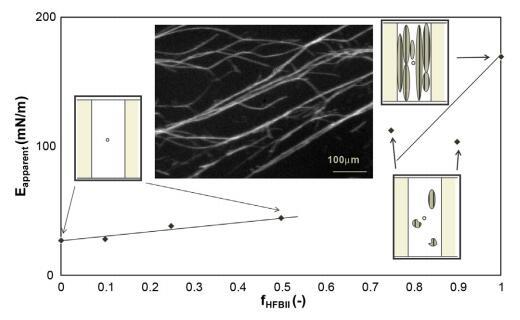 圖2。表觀模量作為擴(kuò)散層HFBII分?jǐn)?shù)的函數(shù),以及槽屏障之間界面上褶皺斑塊的圖示。右邊是純HFBII層的一個(gè)褶皺斑的顯微鏡照片。