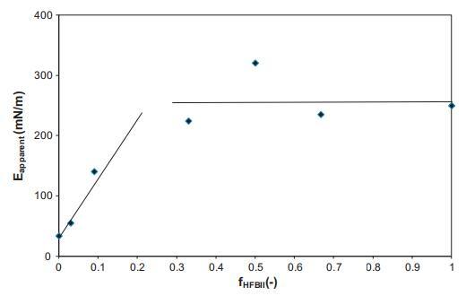 為了便于比較,從圖1的數(shù)據(jù)中,使用表面壓力第一次上升的斜率(由第一次壓縮產(chǎn)生)和公式E=(?2)提取了表觀膨脹模量(E)??1)/ln(A1/A2)。曲線的斜率總是在表面壓力在15到25 mN/m之間波動(dòng)的表面積范圍內(nèi)確定的。圖2顯示了表觀模量作為混合比的函數(shù),表示為HFBII分?jǐn)?shù)fHFBII=cHFBII/(cHFBII+cWPI)。