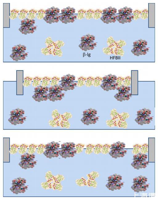 圖7。重復(fù)壓縮和膨脹后HFBII:WPI混合層結(jié)構(gòu)形成示意圖。請(qǐng)注意,乳清蛋白的主要成分BLG僅在此處顯示。壓縮:BLG的一部分從表面排出,形成一個(gè)子層。膨脹:BLG的一部分停留在亞表層,而另一部分可能重新吸附到主層。頂面存在HFBII的凈濃度。