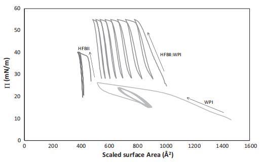 圖4。?/A-純HFBII、純WPI及其1:10混合物的吸附系統(tǒng)的等溫線,所有這些系統(tǒng)的總蛋白質(zhì)濃度均為0.1 mg/ml。等溫線包括第一個(gè)壓縮/膨脹循環(huán)和5個(gè)滯后環(huán)。將HFBII和WPI的表面積縮放至攤鋪系統(tǒng)曲線中彎曲點(diǎn)的出現(xiàn),對(duì)應(yīng)于表面的明顯緊密堆積過渡(圖1)。