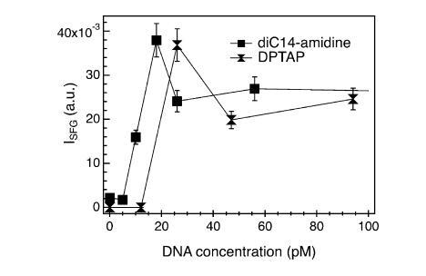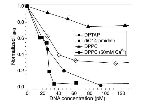 圖7(上圖)所示的壓縮等溫線清楚地表明,DNA對(duì)diC14氨基單層膜的影響,在很大的密度范圍內(nèi),是增加表面壓力,或等效地降低表面張力。也就是說(shuō),加入DNA后,表面生成的自由能總是變得更有利。然而,在沒有進(jìn)一步信息的情況下,這些實(shí)驗(yàn)幾乎無(wú)法深入了解表面熱力學(xué)變化的分子基礎(chǔ)。雙14-氨基單分子膜的CH區(qū)域的VSF光譜作為DNA濃度的函數(shù),以及由此產(chǎn)生的CH3SS/CH2 SS比率,提供了這樣的見解。如圖7(下圖)所示,向亞相添加DNA,即使在40 pM以下的體積濃度下,也會(huì)導(dǎo)致脂質(zhì)尾部順序的強(qiáng)烈增加。在解釋電子自旋共振研究的結(jié)果時(shí),貝納蒂及其同事曾認(rèn)為,吸附的DNA使凝膠相雙氰胺雙層(低于23°C)流態(tài)化,并使液相雙層(高于23°C)僵化,從而有效地平滑了在沒有DNA的情況下急劇的熱相變。91我們的光學(xué)和壓力等溫線測(cè)量都是在略低于熔融溫度的情況下進(jìn)行的。我們的壓縮等溫線表明,DNA的作用是增加表面上單個(gè)鏈之間的相互作用(降低表面張力),而光學(xué)測(cè)量表明,鏈相互作用的增加導(dǎo)致脂質(zhì)尾部更有序。有趣的是,這些結(jié)果與這樣一種情況是一致的,即DNA的加入似乎會(huì)產(chǎn)生脂質(zhì),兩者之間的相互作用比沒有DNA時(shí)更強(qiáng)烈,尾巴比沒有DNA時(shí)更有序,鏈的流動(dòng)性增強(qiáng)。這種脂鏈流動(dòng)性和脂鏈順序的解耦類似于之前觀察到的膽固醇和DPPC混合物隨溫度變化的情況。92