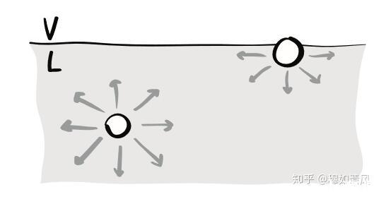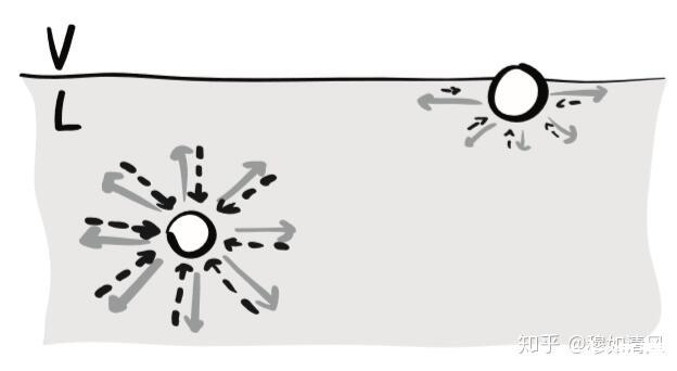 即,對(duì)于體相中的分子,其所受斥力在各方向均等大反向;而對(duì)于位于表面的分子,粒子之間的排斥力從(氣相中的)忽略不計(jì),在經(jīng)過幾個(gè)分子層后,迅速增加到體相的強(qiáng)度。在這一增加過程中,由于排斥力的各向同性本質(zhì),其在任一位置的強(qiáng)度在各個(gè)方向是一樣的。