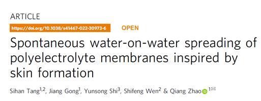 近期,趙強(qiáng)教授課題組在《Nature Communications》在線刊發(fā)了該領(lǐng)域的新進(jìn)展(Spontaneous water-on-water spreading of polyelectrolyte membranes inspired by skin formation,Nat.Commun.13,3227,2022.),提出了一種聚電解質(zhì)水溶液在水面自發(fā)鋪展,形成多孔膜的機(jī)制。文章第一作者是化學(xué)與化工學(xué)院2020屆碩士畢業(yè)生湯思晗,合作單位包括華中科技大學(xué)材料科學(xué)與工程學(xué)院,協(xié)和醫(yī)院。研究得到國家自然科學(xué)基金,國家重點(diǎn)研發(fā)計(jì)劃和三峽實(shí)驗(yàn)室開放基金的支持。