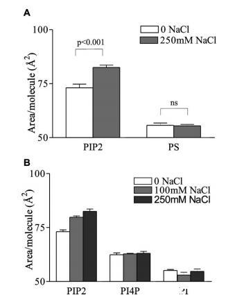 圖2:。鹽膨脹效應(yīng)對(duì)PIP2的特異性。(A)L-R PIP2和L-R PS的每分子面積;和(B)HEPES緩沖亞相上的L-R PIP2、L-R PI(4)P和L-R PI,pH 7.4,π)30mN/m下的30°C。平均值(SE,n)4。