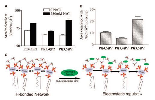 圖5:。亞相氯化鈉膨脹效應(yīng)的PIP2異構(gòu)體特異性。(A)HEPES緩沖亞相上的DO-PIP2異構(gòu)體在π)30 mN/m時(shí)的每分子面積。平均值(SE,n)7。(B)250 mM NaCl和無(wú)亞相NaCl之間DOPIP2異構(gòu)體的每分子面積差異。通過(guò)雙向ANOVA測(cè)量,NaCl效應(yīng)的異構(gòu)體依賴性顯著達(dá)到p)0.0001。(C)PIP2分子間相互作用的概念動(dòng)畫(huà)。在沒(méi)有潮向性試劑(綠色橢圓)的情況下,PIP2分子形成水介導(dǎo)的氫鍵網(wǎng)絡(luò)。當(dāng)添加潮向性聚合物時(shí),網(wǎng)絡(luò)被破壞,帶電磷酸鹽之間的靜電排斥導(dǎo)致單層的膨脹。
