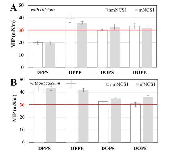 圖6.nmNCS1(白色)和mNCS1(灰色)的MIP值,在不存在鈣(A)和存在鈣(B)的情況下,具有DPPS、DPPE、DOPS和DOPE。MIP值的不確定性如第2.3節所述計算。