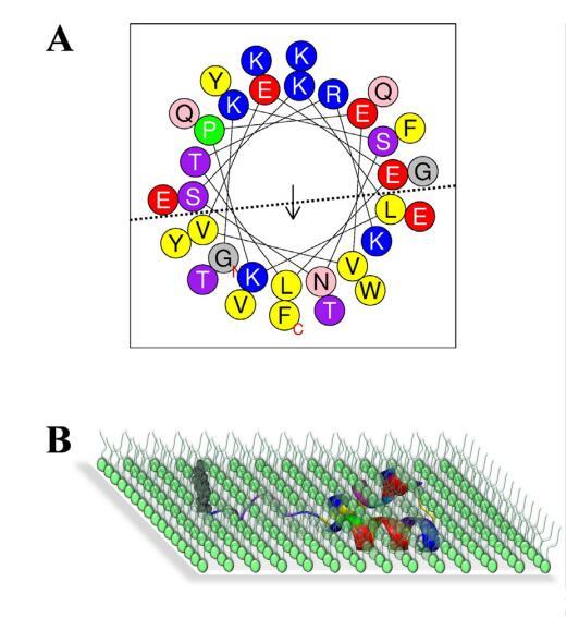 圖8.(A)使用在線工具Heliquest[78]建立的N-末端肽的螺旋輪表示法。顏色代碼如下:疏水殘基為黃色,絲氨酸和蘇氨酸為紫色,堿性殘基為藍色,酸性殘基為紅色,天冬酰胺和谷氨酰胺為粉紅色,脯氨酸為綠色,其他殘基為灰色。(B)在存在脂質單層的情況下N-末端肽的方向的圖示。使用與(A)相同的顏色代碼(為了解釋本圖例中對顏色的引用,讀者請參閱本文的web版本)。