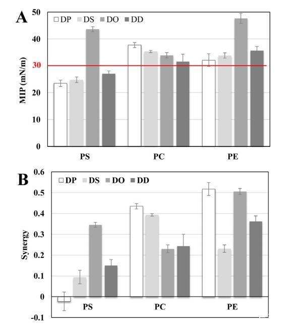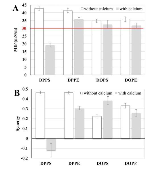 圖7.在鈣存在下,使用DPP、DSP、DOPS、DDPS、DPPC、DSPC、DOPC、DOPC、DDPC、DPPE、DSPE、DOPE、DOPE和DDPE的單層的N-末端肽的MIP(A)和協同作用(B)值。MIP和synergy值的不確定性如第2.3節所述計算。