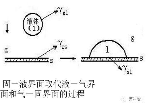 固體浸于液體中的過(guò)程稱為浸濕。此過(guò)程是固氣界面被固液界面取代,氣液界面無(wú)變化,此過(guò)程自由能變化為