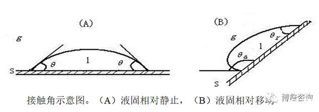 將一液體滴到一平滑均勻的固體表面上,若不鋪展,將形成一平衡液滴,其形狀由固液氣三相交界面處所作氣液界面之切線經(jīng)液滴至固液界面所成之夾角決定,此角稱為該種液體在所研究固體表面上之接觸角,或稱潤(rùn)濕角。接觸角常以θ表示。