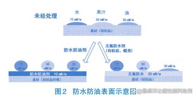 圖2中展示了,含氟防水防油劑通過降低纖維表面張力,達到優異的防水防油效果。如通常棉的臨界表面張力為γc≈200 mN/m,而常溫下水、果汁、油的表面張力分別為72、50、30mN/m,所以棉很容易被以上液體潤濕。經過含氟整理劑處理后,棉纖維表面張力下降至約10 mN/m,呈現出良好的防水防油性。而無氟防水劑本身的表面張力比較高,只能防水或者防部分水溶性液體(如牛奶、果汁等),達不到防油的效果。
