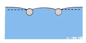 麥片圈效應(yīng)中使得麥片相互吸引的因素是麥片之間的橫向毛細力(Lateral Capillary Force),橫向毛細力可分為吸引力和排斥力,這里表現(xiàn)為吸引力。我們通過一個簡單的例子,來說明一下橫向毛細力產(chǎn)生的原因。首先考慮單個小球放置在液面上保持平衡,意即在重力的作用下對液面形成一個擾動,此時若液面上存在另外一個小球時,這種擾動會相互疊加,下圖中的液面便是最終的擾動狀態(tài)。