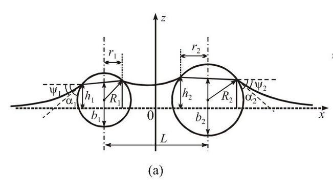 從能量的角度來看,液體表面能并不是由獨立放置單個小球時液面表面能的簡單相加,還要加上一項因另外一個小球存在時的相互表面能,其與小球之間的距離直接相關(guān)。這種相互表面能表現(xiàn)為沿小球連線方向的橫向毛細力。